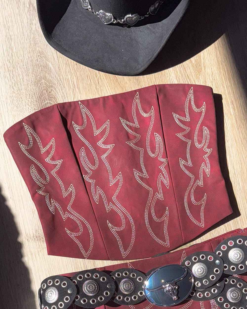 Dark Red Faux Leather Embroidered Western Cowboy Corset Top