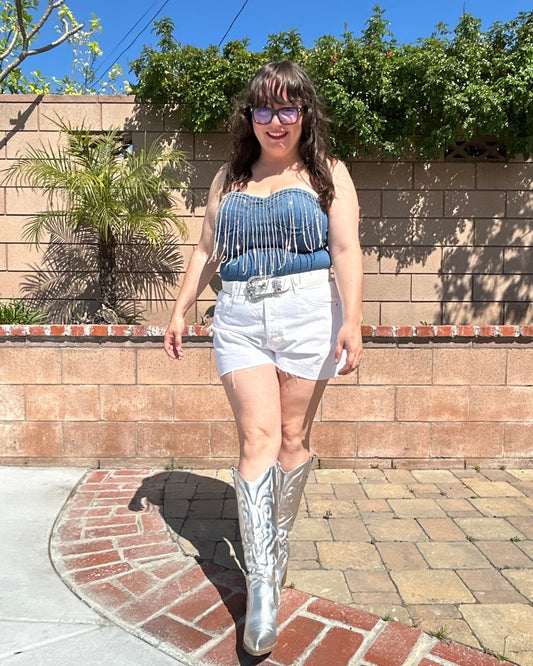 Medium Wash Rhinestone Fringe Strapless Denim Bodysuit