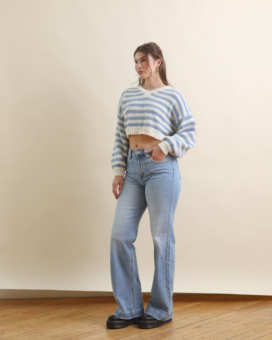 Light Blue Multi Long Sleeve V-Neck Striped Cropped Sweater