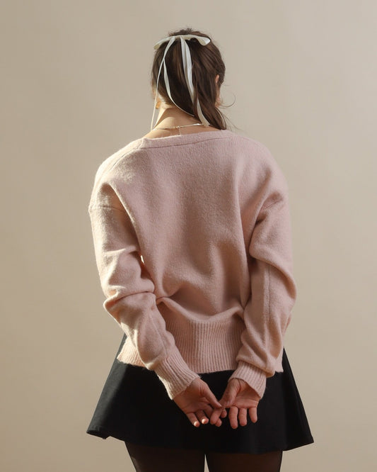 Light Pink Split Hem Balloon Sleeve V-Neck Sweater