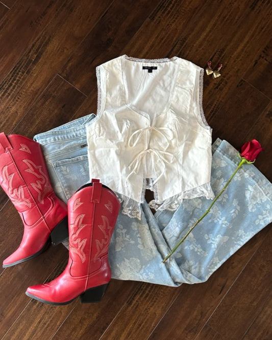 Sweet Tea White Multi Floral Print Lace Trim Milkmaid Corset Top