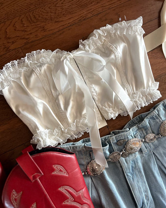 White Lace Trim Bustier Bow Tie Front Crop Top