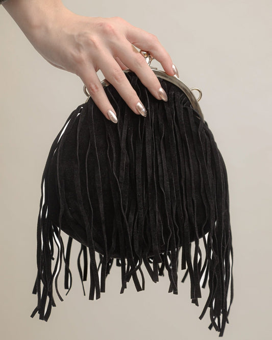 Black Faux Leather Round Fringe Purse With Chain Strap