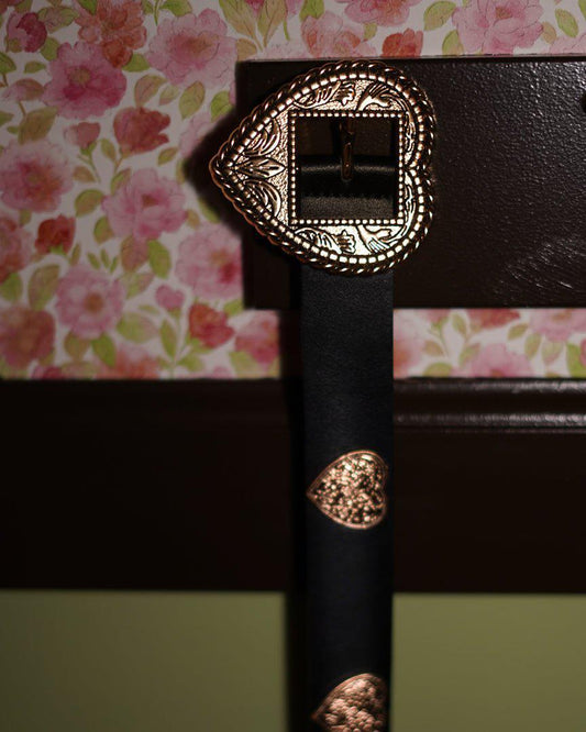 Black Etched Faux Leather With Golden Heart Buckle Belt