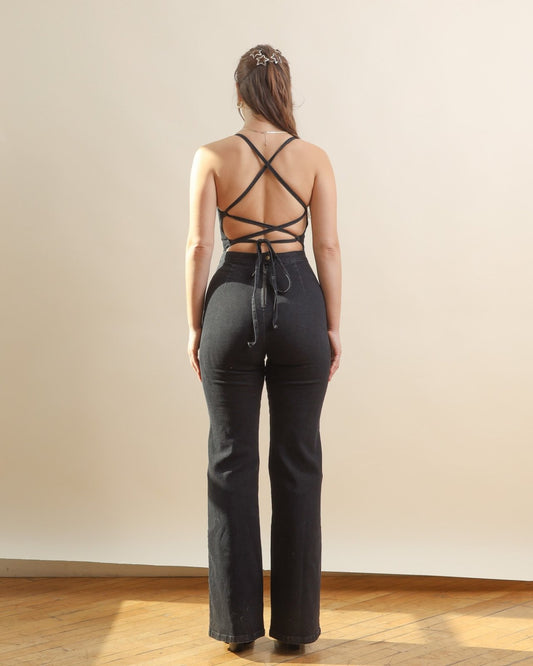 Blue Lace Up Backless Flared Denim Jumpsuit