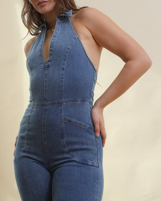 Medium Wash Collared Backless Halter Denim Jumpsuit