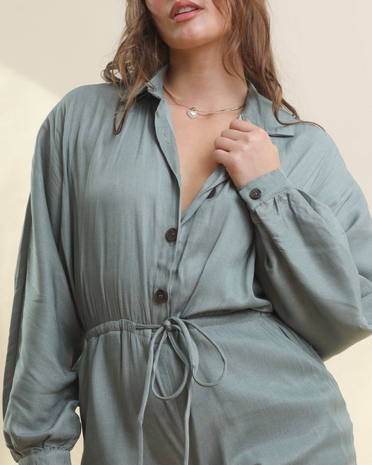 Brat Summer Lime Green Denim Pleated Collared Backless Romper