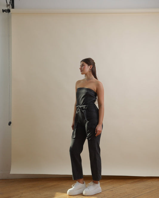 Washed Black Strapless Cargo Jumpsuit with Pockets