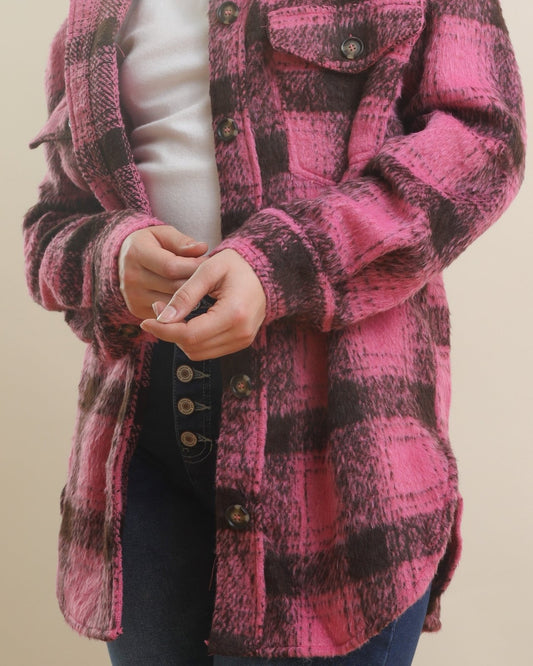 Hot Pink Oversized Long Sleeve Plaid Shacket