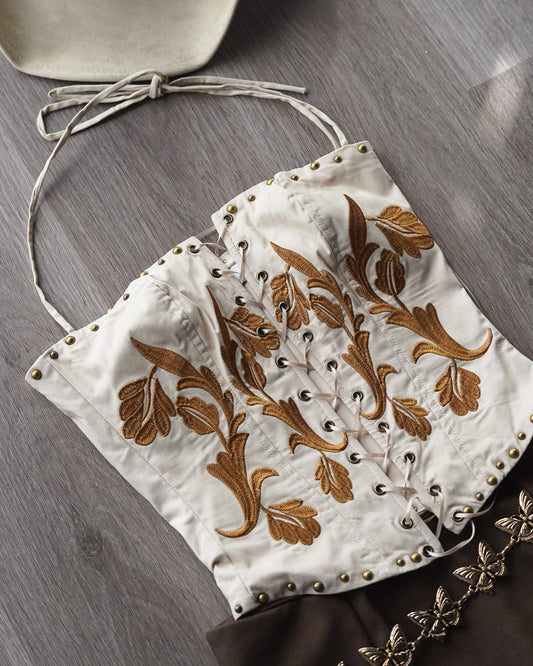 Hawthorne Khaki Woven Floral Embroidered Studded Lace Front Corset Top