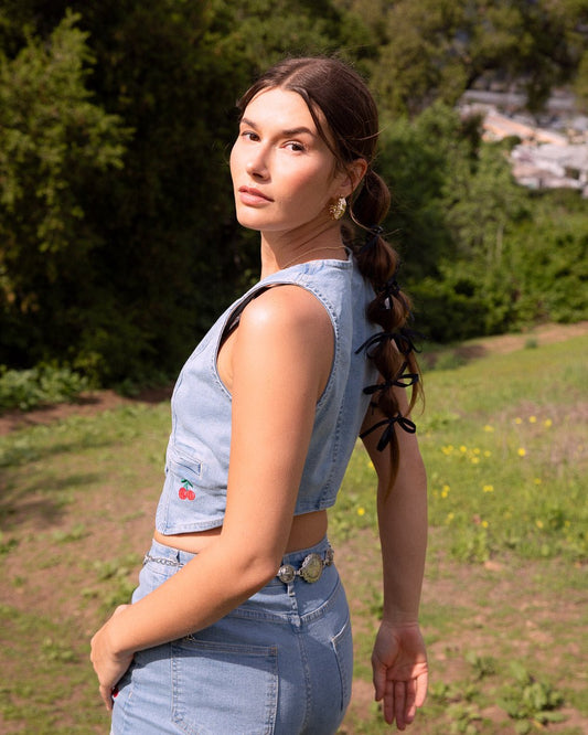 Cherry On Top Light Wash Cherry Embroidered Denim Vest TopRegular price $20.00 USDRegular priceUnit price / per$34.99 USDSale price $20.00 USDSale