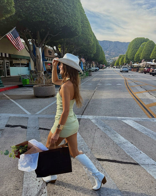 Sweet Pea Sage Green Gingham Tie Front Halter Mini DressRegular price $59.99 USDRegular priceUnit price / per-