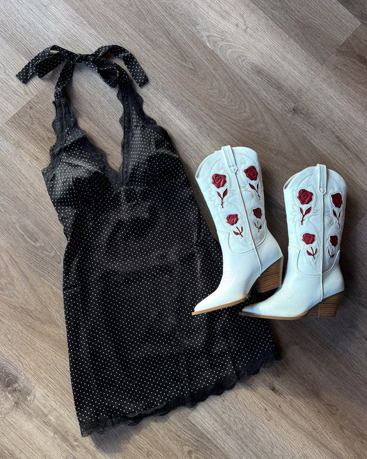 Lila Black And White Polka Dot Lace Trim A-Line Halter Mini Dress