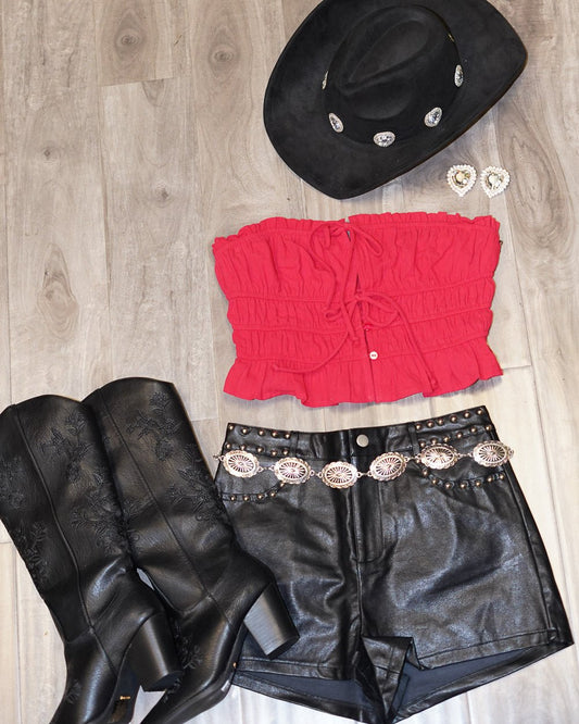 Red Coquette Strapless Tie Front Ruffle Crop Top