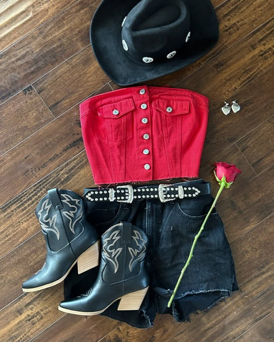Dark Red Faux Leather Embroidered Western Cowboy Corset Top