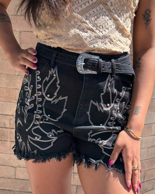 Vespera Black Western Embroidered Denim Buckle Shorts