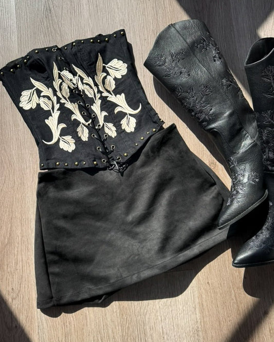 Black Faux Suede Western Embroidered Strapless Corset Top
