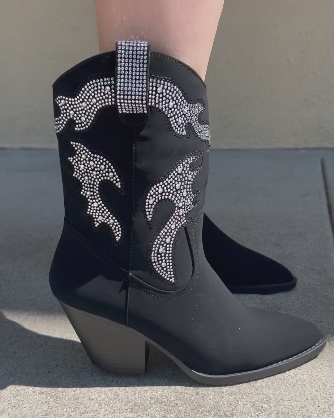 Dazzle the crowd while you two-step in our Starlight Boots! These Black Rhinestone Western Cowboy Pointed Toe Ankle Boots are the perfect blend of classic country and show-stopping glam. Sleek black faux suede meets eye-catching rhinestone embellishments, a classic pointed toe, a durable sole and a sturdy ankle height for versatile styling. Whether you're hitting up your favorite honky-tonk, rodeo-bound with your girls, or just adding sparkle to your everyday look, these pair with your favorite corset top and faux suede skirt!