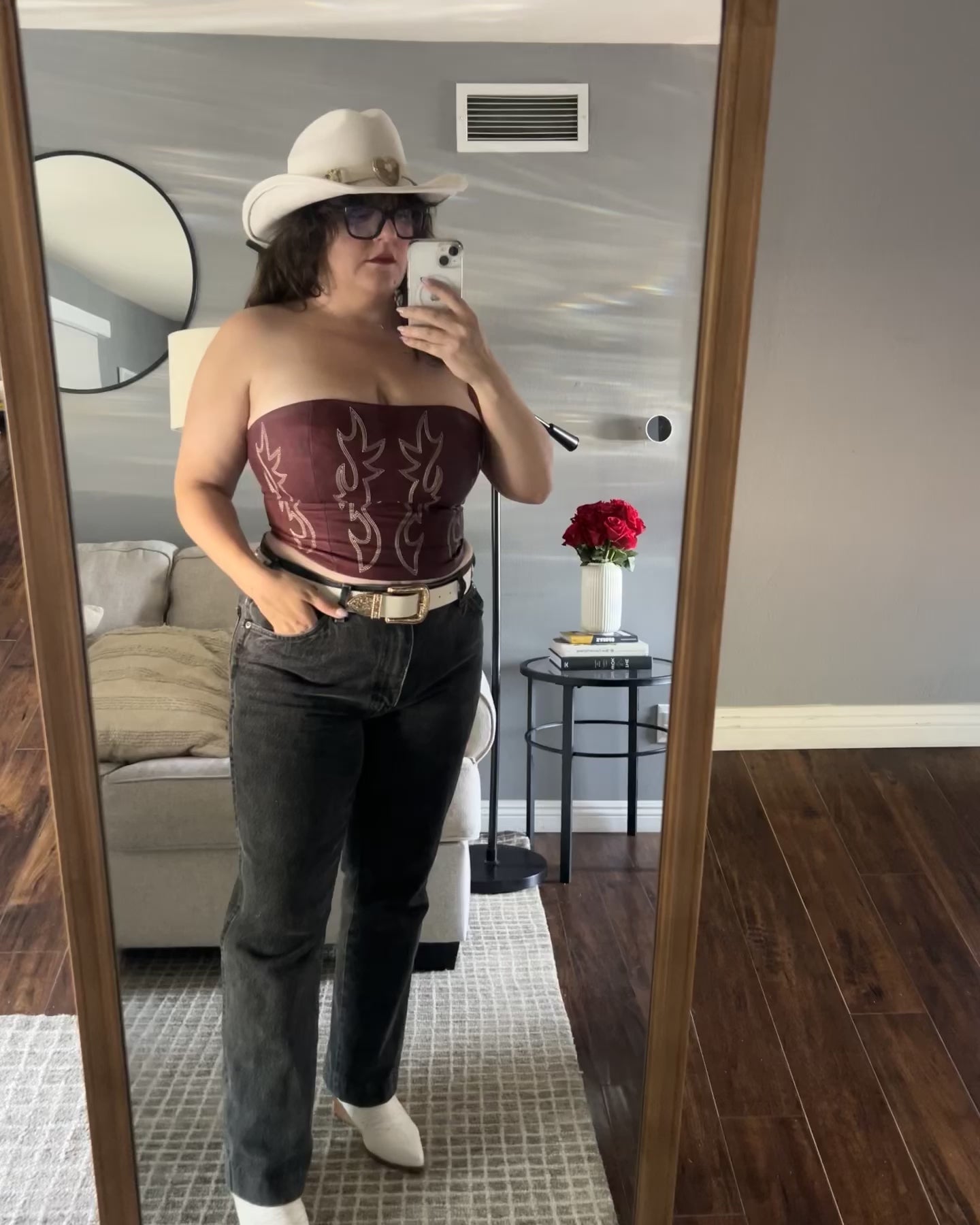 The hottest country concert outfit starts with our Dark Red Faux Leather Embroidered Western Cowboy Corset Top! This dark red corset top features a strapless neckline, lace up back, cropped hem, and western-inspired stitching that's as fiery as you. Pair with your favorite cowboy boots and denim skort.
