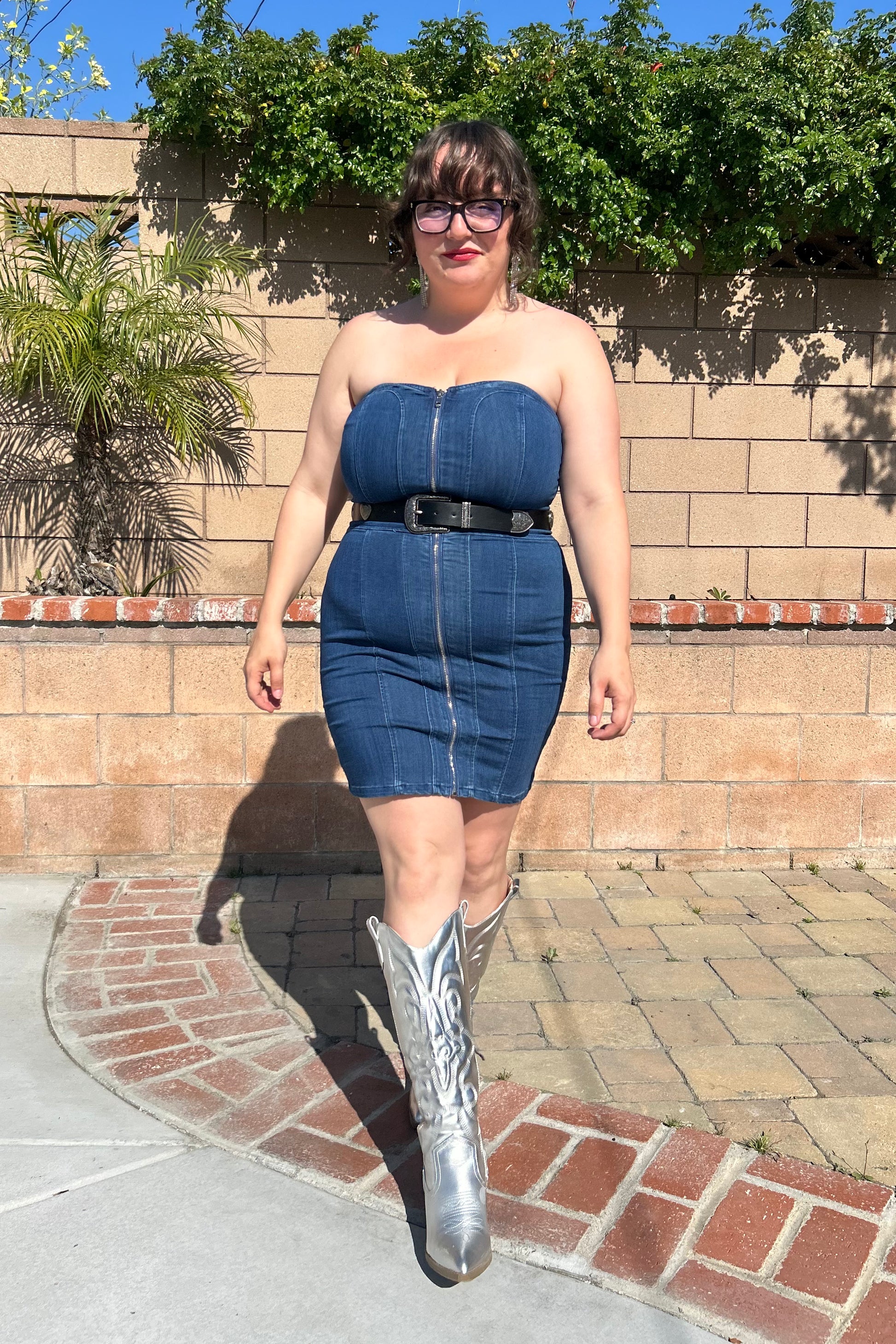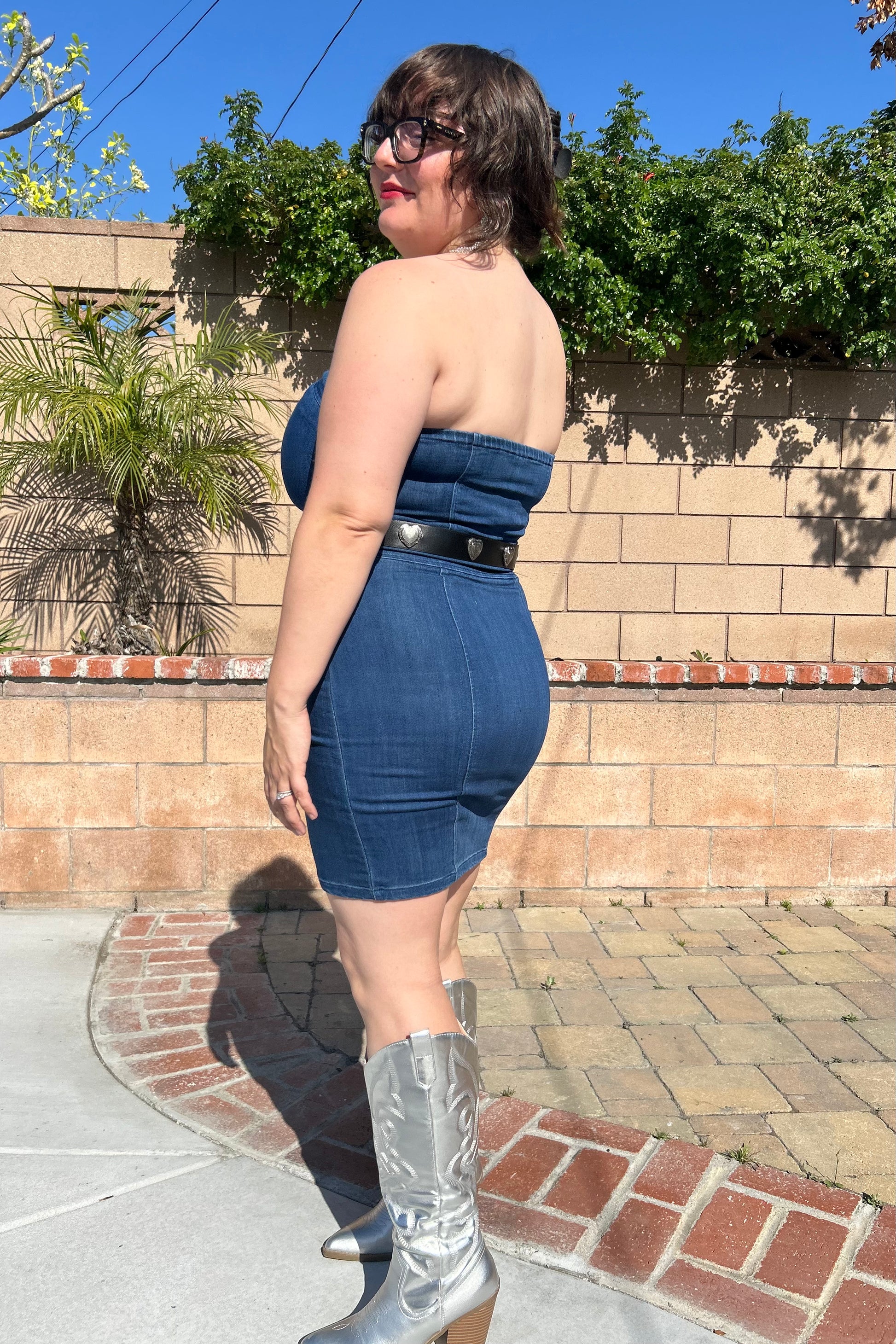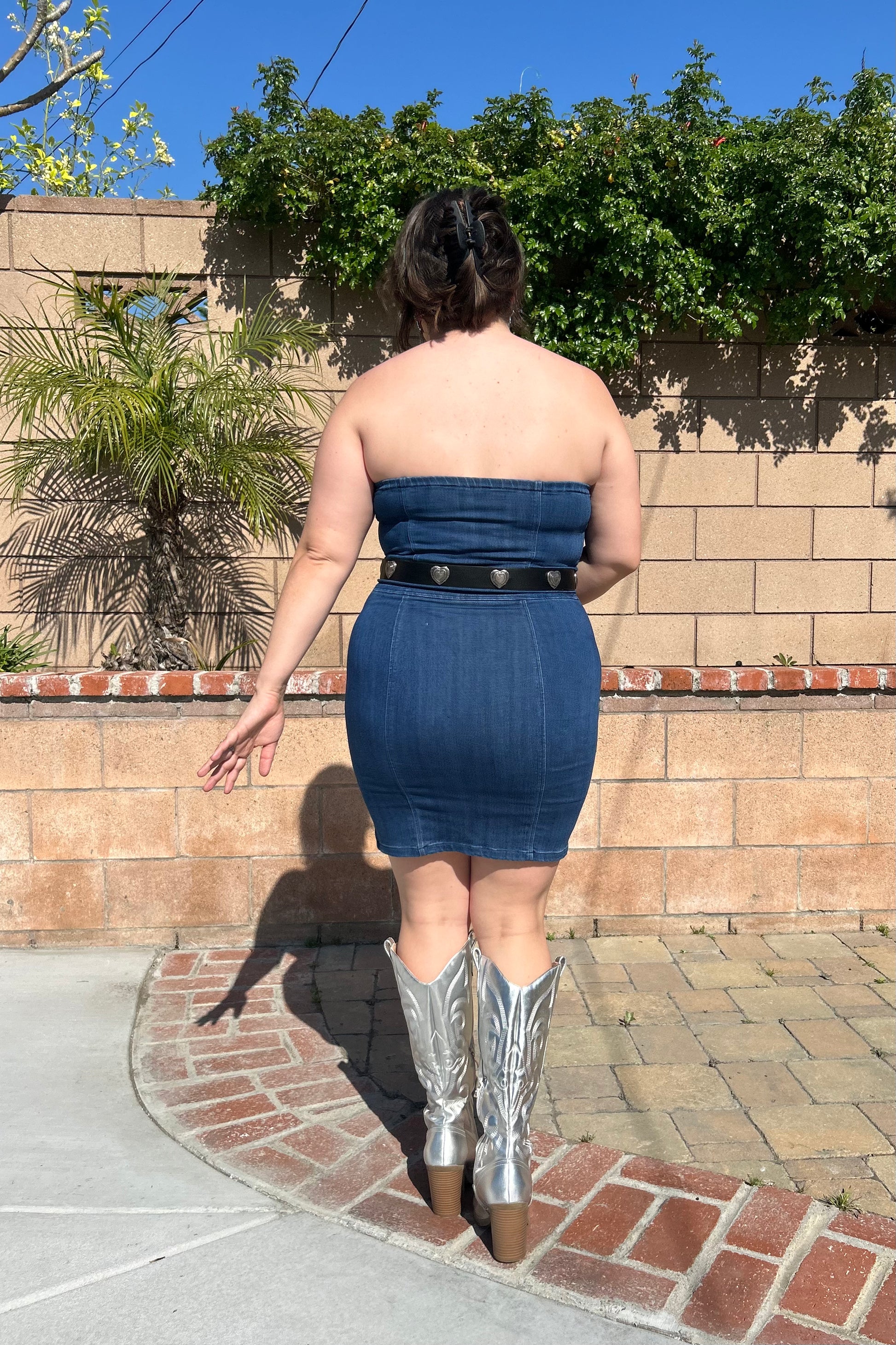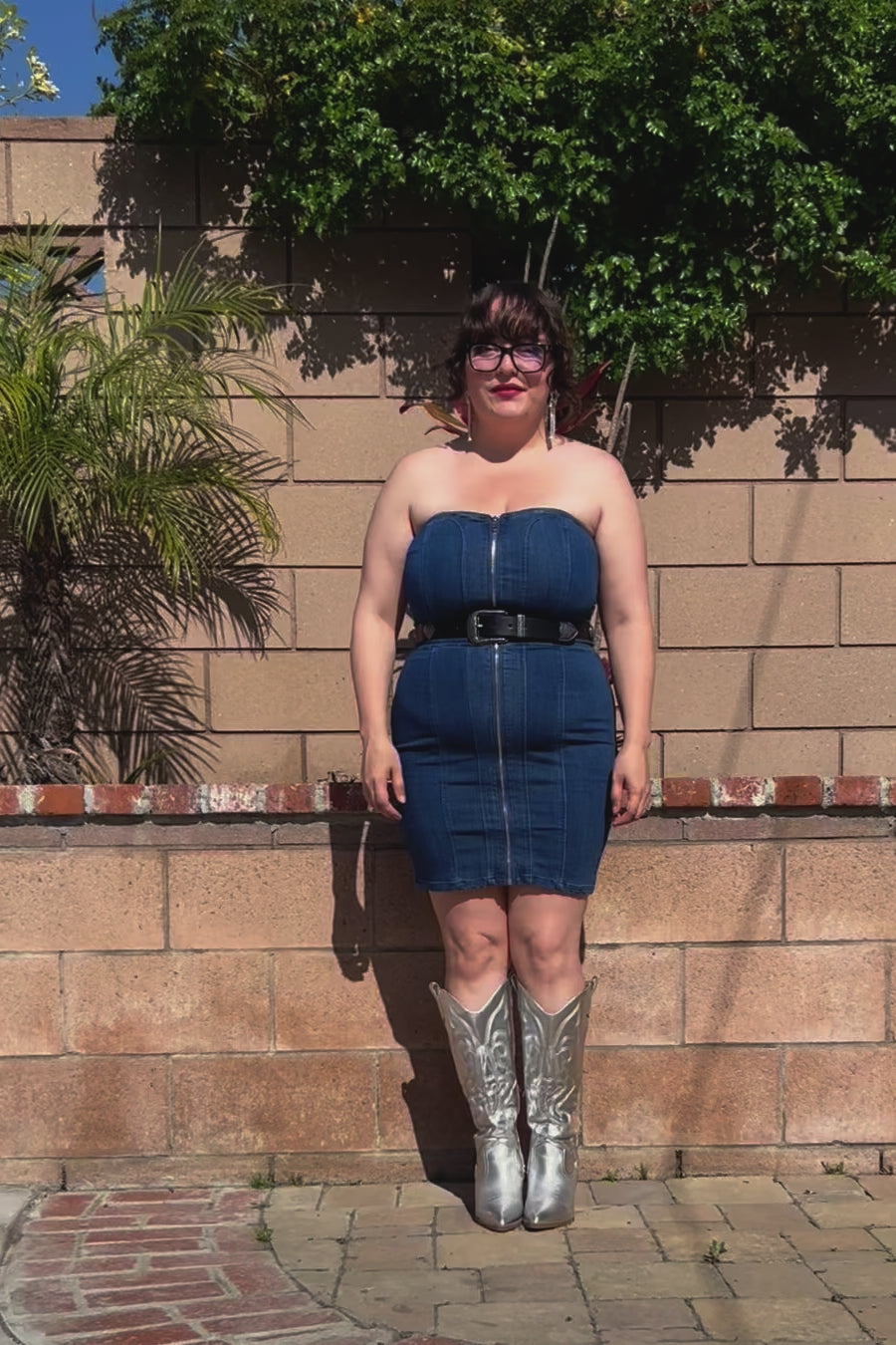 Our Dark Wash Blue Zip Front Bustier Denim Bodycon Dress is the versatile style your closet needs! Whether country concert or date night-bound, this mini dress is easy to dress up or down for any need. The bustier bodice is figure-flattering while the zip-front detail adds form and function. Pair with your favorite boots and statement earrings for a fun night out!