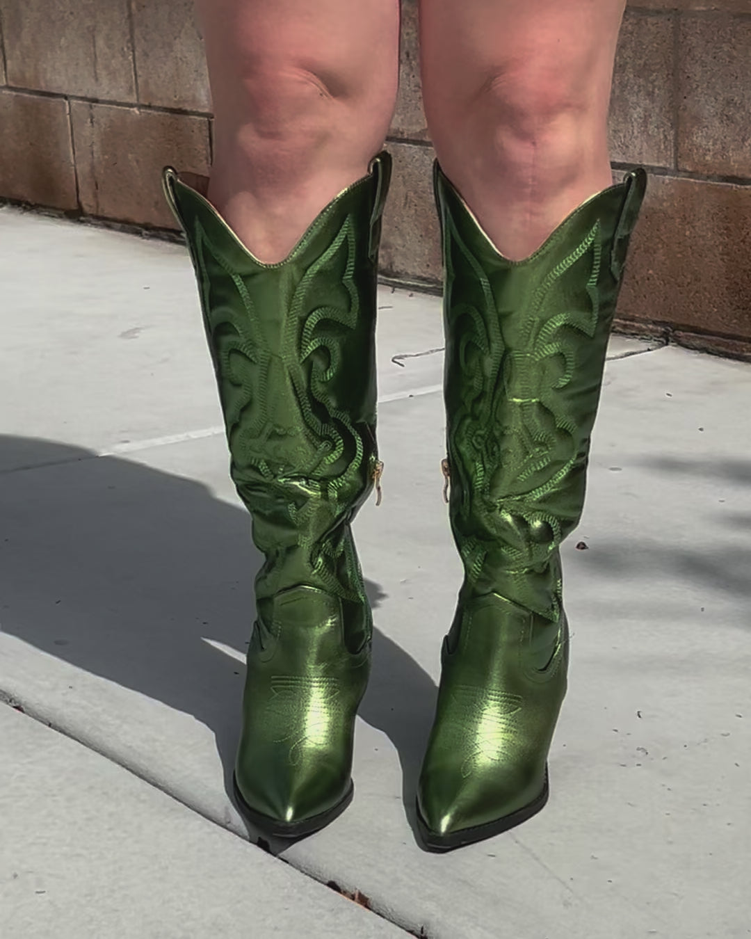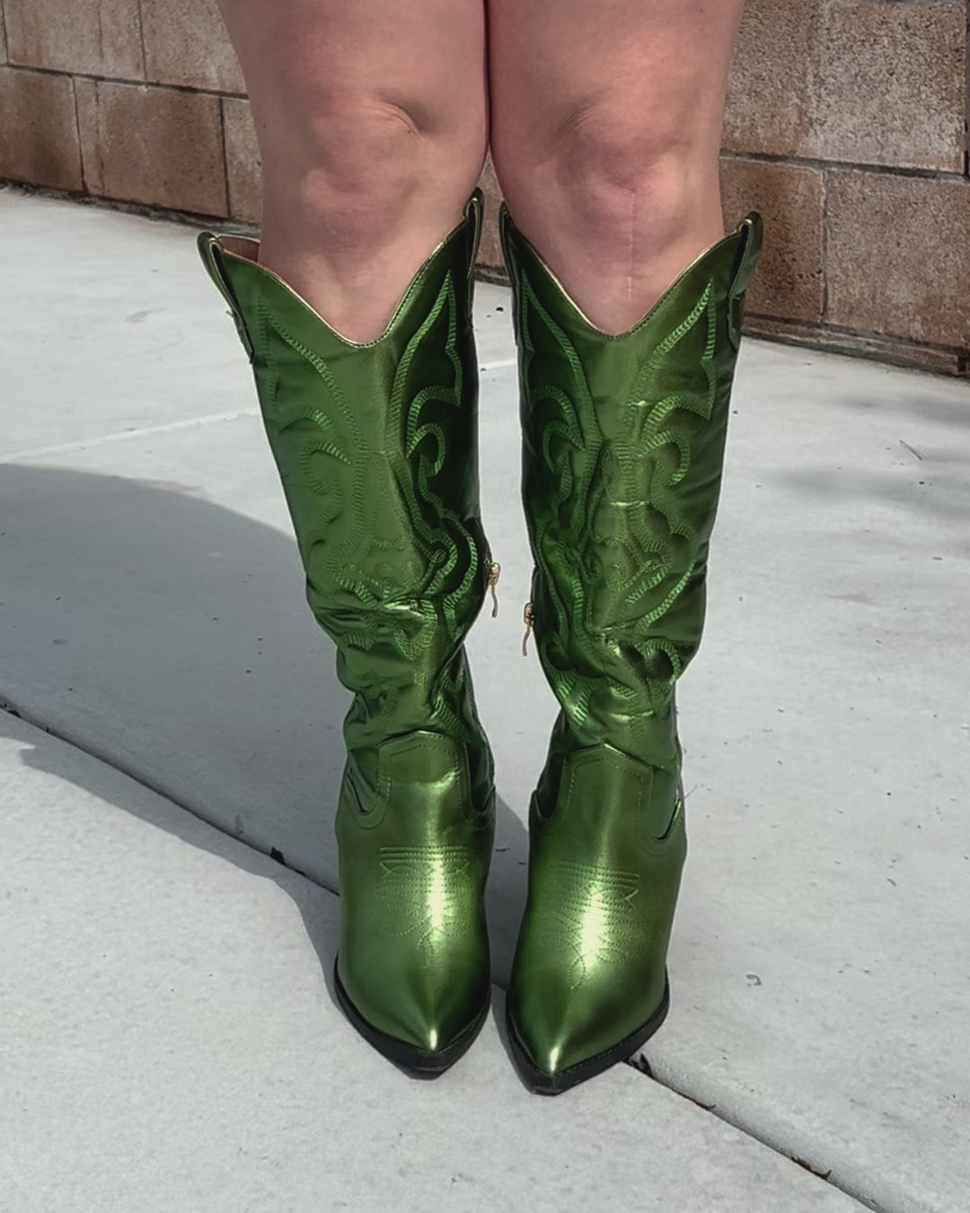Stand out from the crowd with our Metallic Green Cowgirl Boots! These cute green western boots feature a 3.75" heel & intricate stitching that complements any outfit. Wear to your next concert, festival, rodeo or just because!